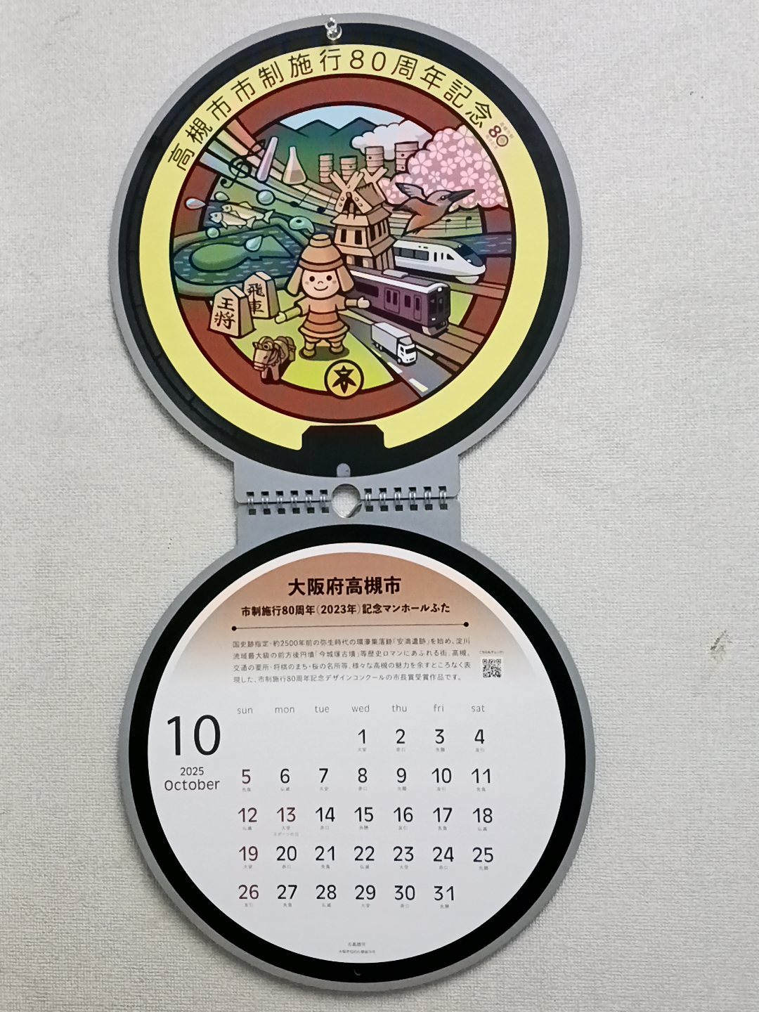 ブログ BLOG カテゴリーリスト いそろく砂かけばば〜未分類隊長へぼ監督キャプテンおおもり君翠巒クラブ すべて TOPブログへぼ監督先月のマンホールカレンダーは大阪府高槻市 市制施行80周年(2023年)記念マンホールふた 先月のマンホールカレンダーは大阪府高槻市 市制施行80周年(2023年)記念マンホールふた 2025.11.02 へぼ監督 国史跡指定・約2500年前の弥生時代の環濠集落跡「安満遺跡」を始め、淀川流域最大級の前方後円墳「今城塚古墳」等歴史ロマンにあふれる街、高槻。 交通の要所・将棋のまち・桜の名所等、様々な高槻の魅力を余すところなく表現した、市制施行80周年記念デザインコンクールの市長賞受賞作品です。 Prev 一覧に戻る Next